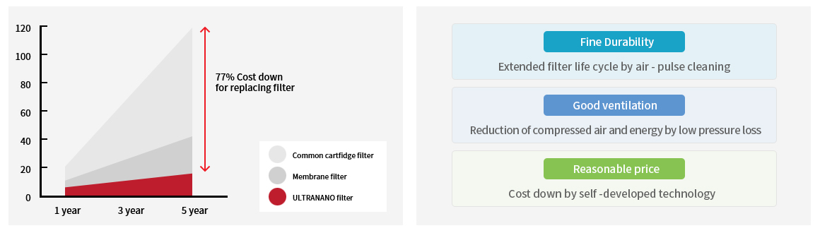Welding fume is small and fine, so the general filter is easy to be clogged. The special filter coated with Nano fiber removes the dust 99% at 0.3 microns. In addition, the Nano Filter has superior air permeability and has superior dust removal efficiency and longer service life than general filters.