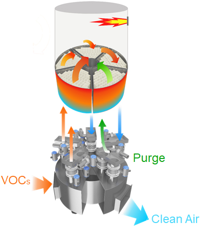 축열 소각법(RTO) 농축기로부터 농축, 탈착된 성분을 축열식 소각기로 소각함