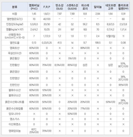 • PVC+FRP: 내구성이 좋으며, 가볍고 저렴하지만, 내화학성이 FRP보다 낮다.