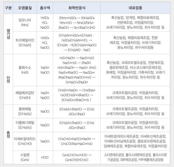 구분 오염물질 흡수액 화학 반응식 대표 업종