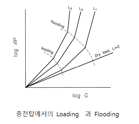 • loading point (부하점) : 세정액의 hold-up이 증가하여 압력손실 및 세정액의 하강속도가 급격이 변하는 첫번째 파과점